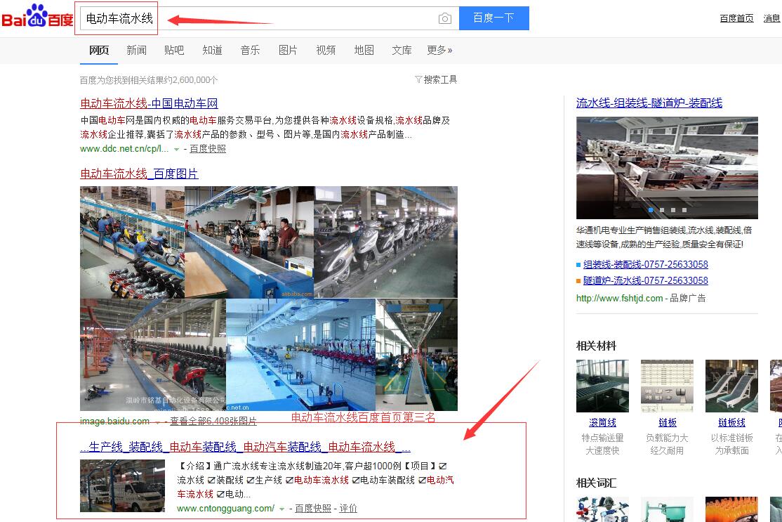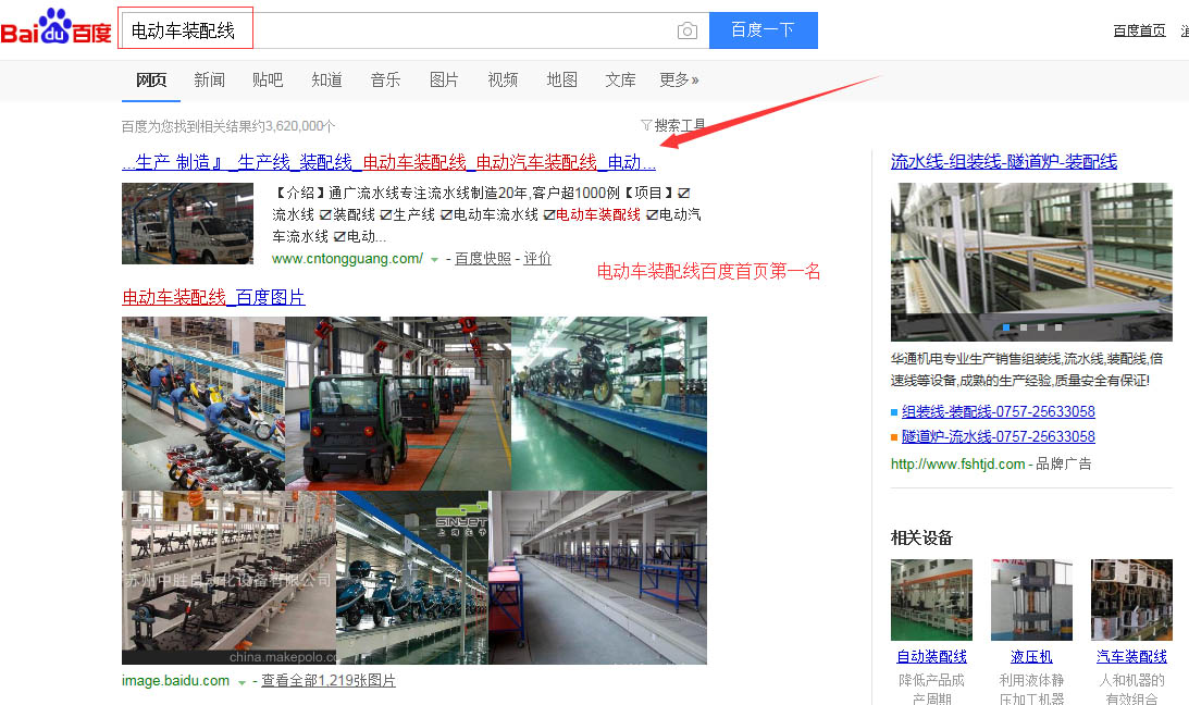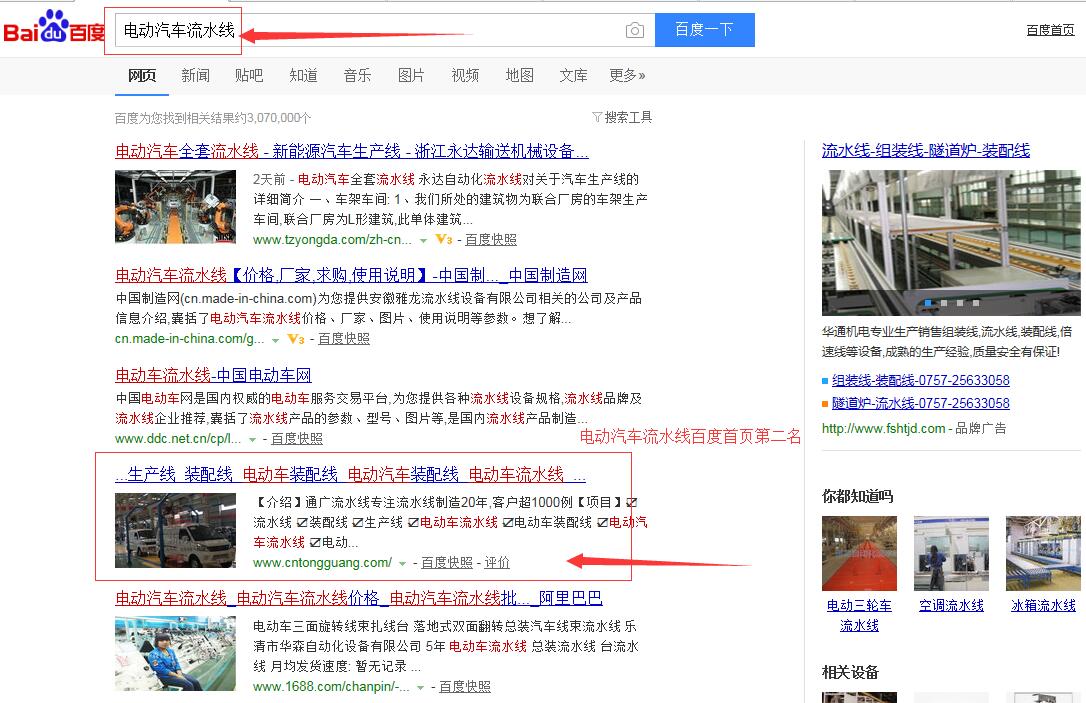 “電動車裝配線”百度首頁第一名,請看下方截圖 ,“電動車流水線”,“電動汽車流水線”,“電動汽車裝配線”,等等,很多關(guān)鍵詞都在百度首頁,請看如下截圖,有圖為證。在此特意感謝臺州SEO(通盛網(wǎng)絡(luò))人員為我公司網(wǎng)站所做的付出與努力